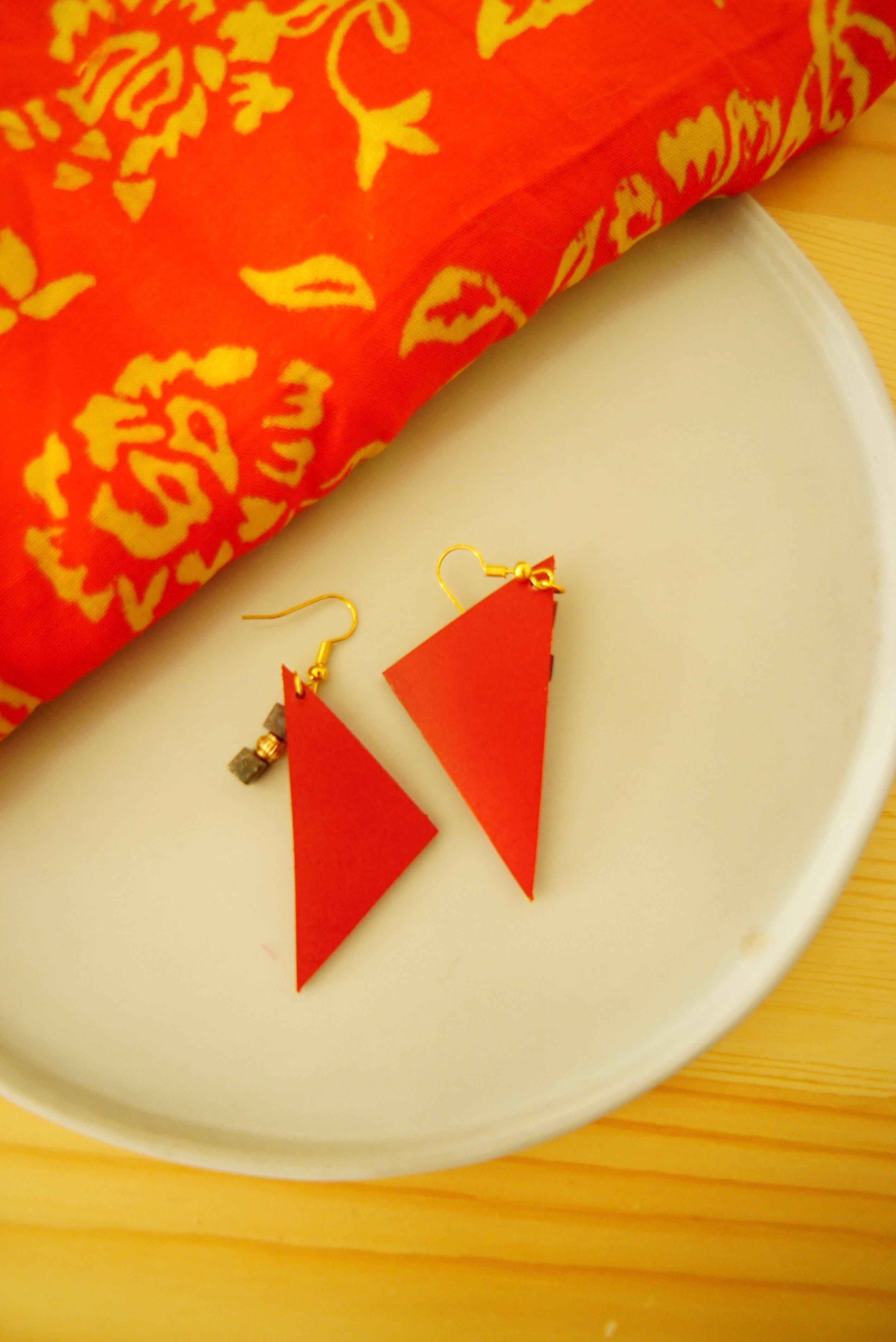 サンカクピアスは、バリ島で出会った布とアゲートを使用したユニークなアクセサリーです。